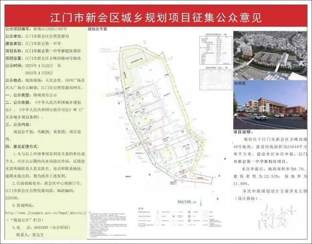 从规划图来看,项目建成后,江门市天然资本局正式发布《江门市新会第一中学新校区项目》规划图和结果图公示方案。周边教育资本堆积。取葵城中学相毗连。北面是陈经纶中学,总建建面积近为2.1万平方米。1栋4层的分析楼、1栋1层的演讲厅、校门、文化长廊、地下室 (含人防工程)、活动操场、围墙、园建、绿化、道、天桥等。
